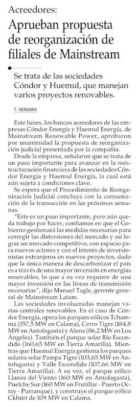 Mainstream: acreedores aprueban reorganización para dos sociedades en Chile - (Diario Financiero)