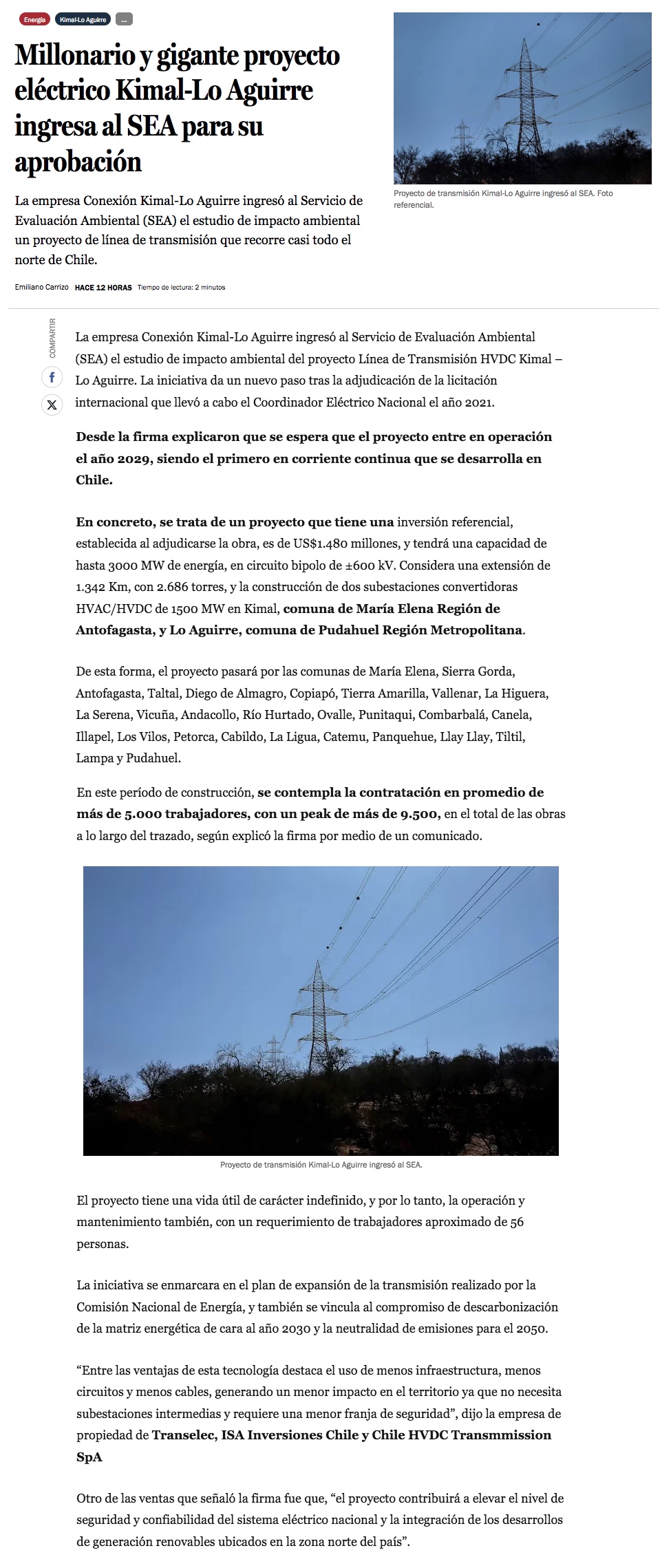 Firma Conexión prevé inversión de US$ 1.480 mills. para proyecto de transmisión Kimal–Lo Aguirre - (El Mercurio de Santiago)