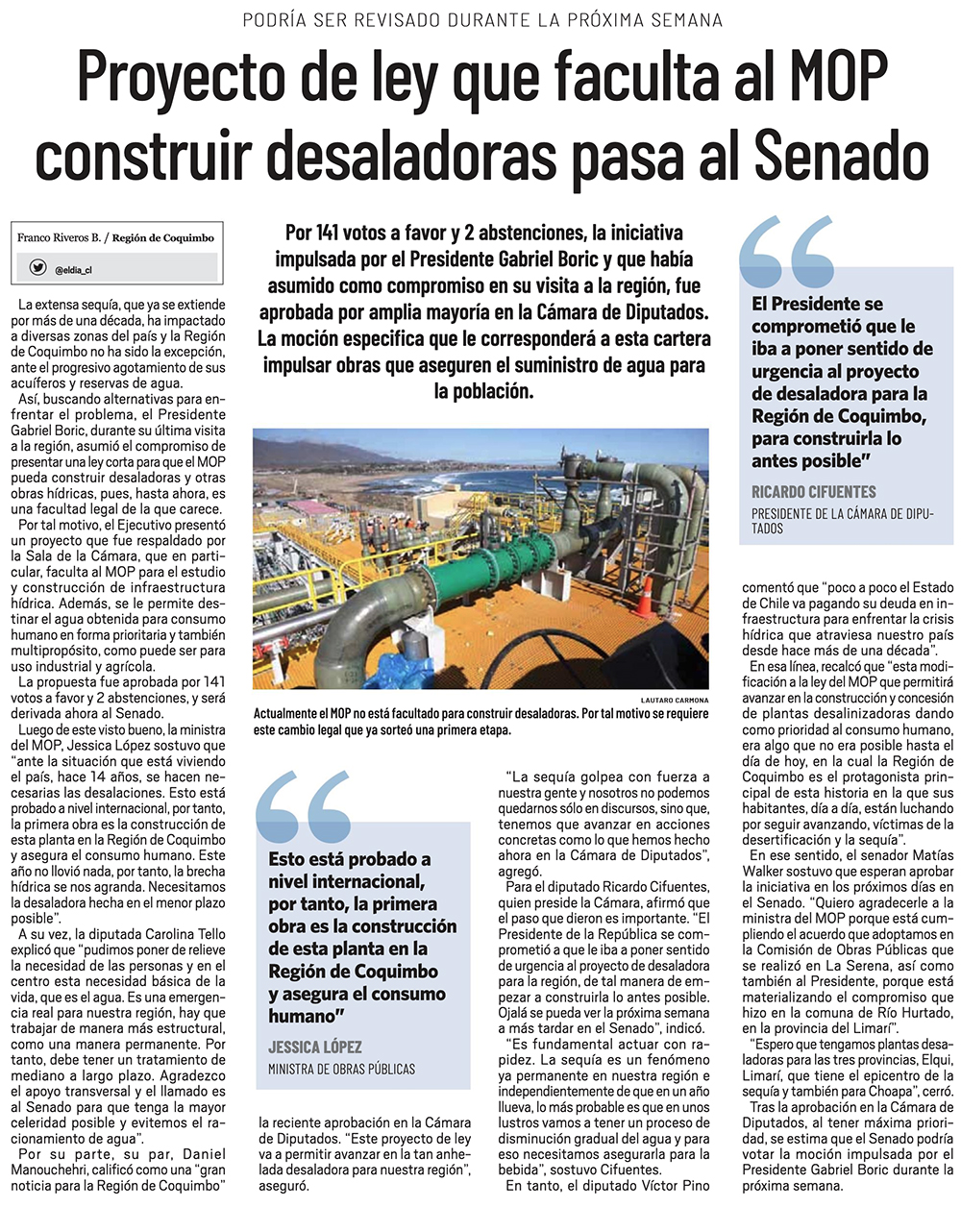 Aprueban por unanimidad proyecto que permitirá al MOP construir una planta desaladora en la Región de Coquimbo - (La Región)