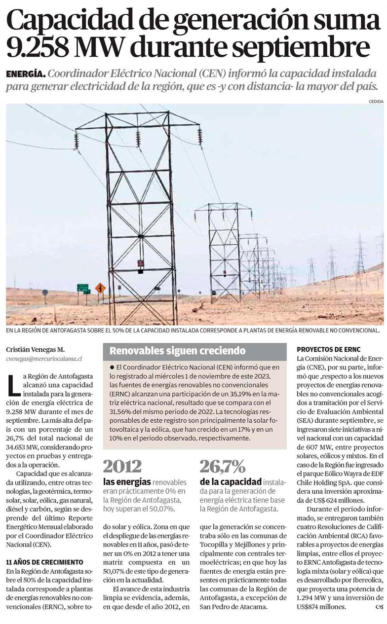 Capacidad de generación suma 9.258 MW durante septiembre - (El Mercurio de Antofagasta)