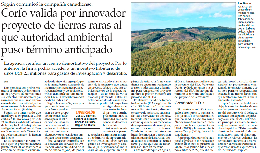 Corfo certifica proyecto de tierras raras en Penco y otorga US$ 2,1 millones en incentivos - (Diario Financiero)
