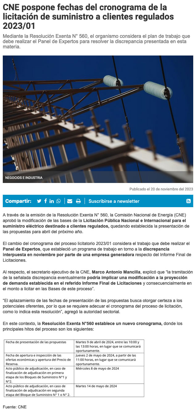 CNE realiza nuevo ajuste a licitación: posterga presentación de ofertas para abril de 2024 - (Diario Financiero)
