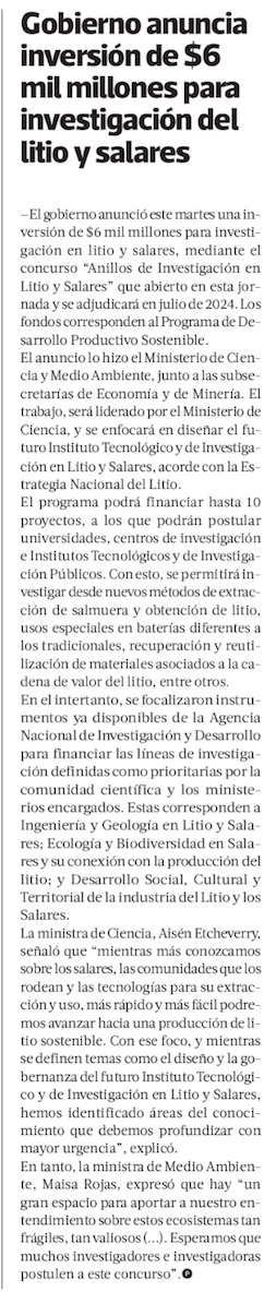 Gobierno lanza convocatoria para proyectos de investigación en litio y salares - (Diario Financiero)