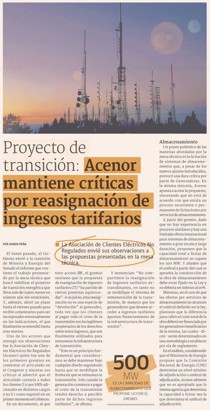 Proyecto de transición energética: Acenor mantiene críticas por reasignación de ingresos tarifarios y cuestiona licitación de almacenamiento - (DF Online)