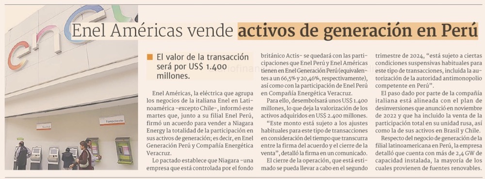 Enel Américas vende sus activos en Perú a empresa ligada a Actis - (El Mercurio de Santiago)