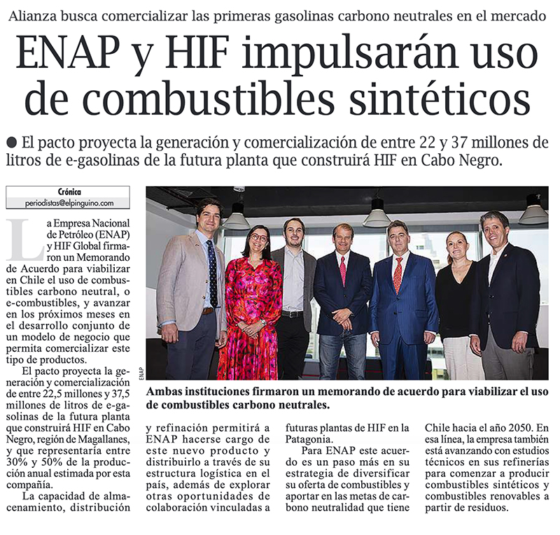 Enap y HIF Global firman acuerdo para producir y comercializar combustibles sintéticos - (El Heraldo (Linares))