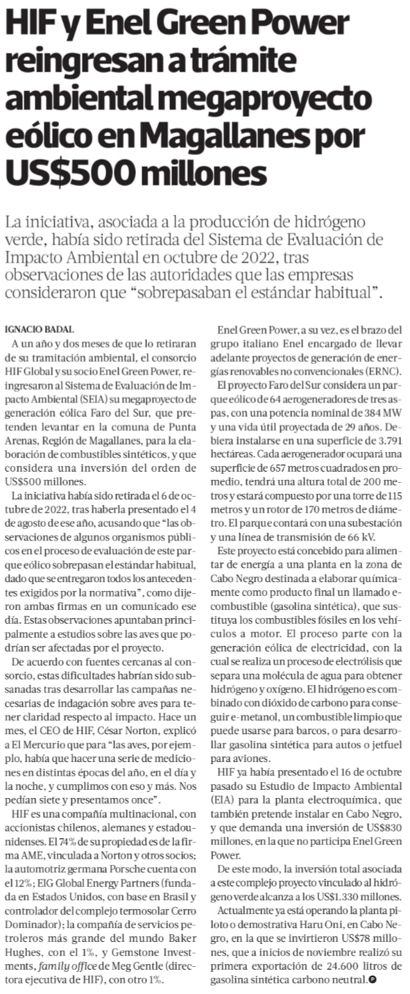 HIF Global ingresa a evaluación ambiental proyecto eólico de US$ 500 millones en Chile - (americaeconomia online)
