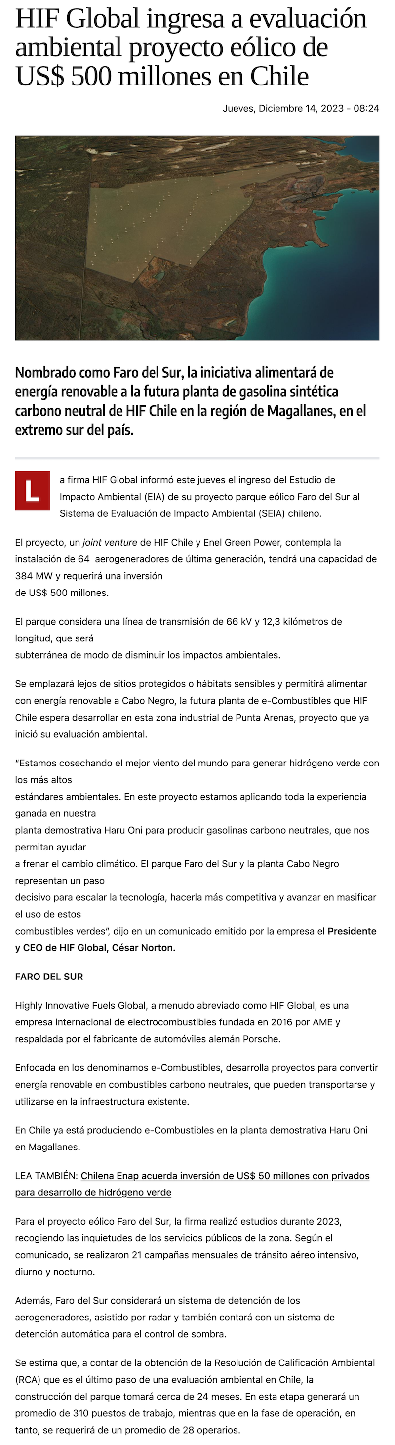 HIF y Enel Green Power reingresan a trámite ambiental megaproyecto eólico en Magallanes por US$500 millones - (Pulso)