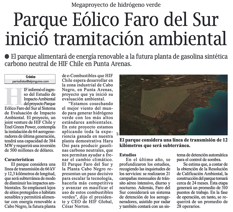 HIF y Enel Green Power reingresan a trámite ambiental megaproyecto eólico en Magallanes por US$500 millones - (Pulso)