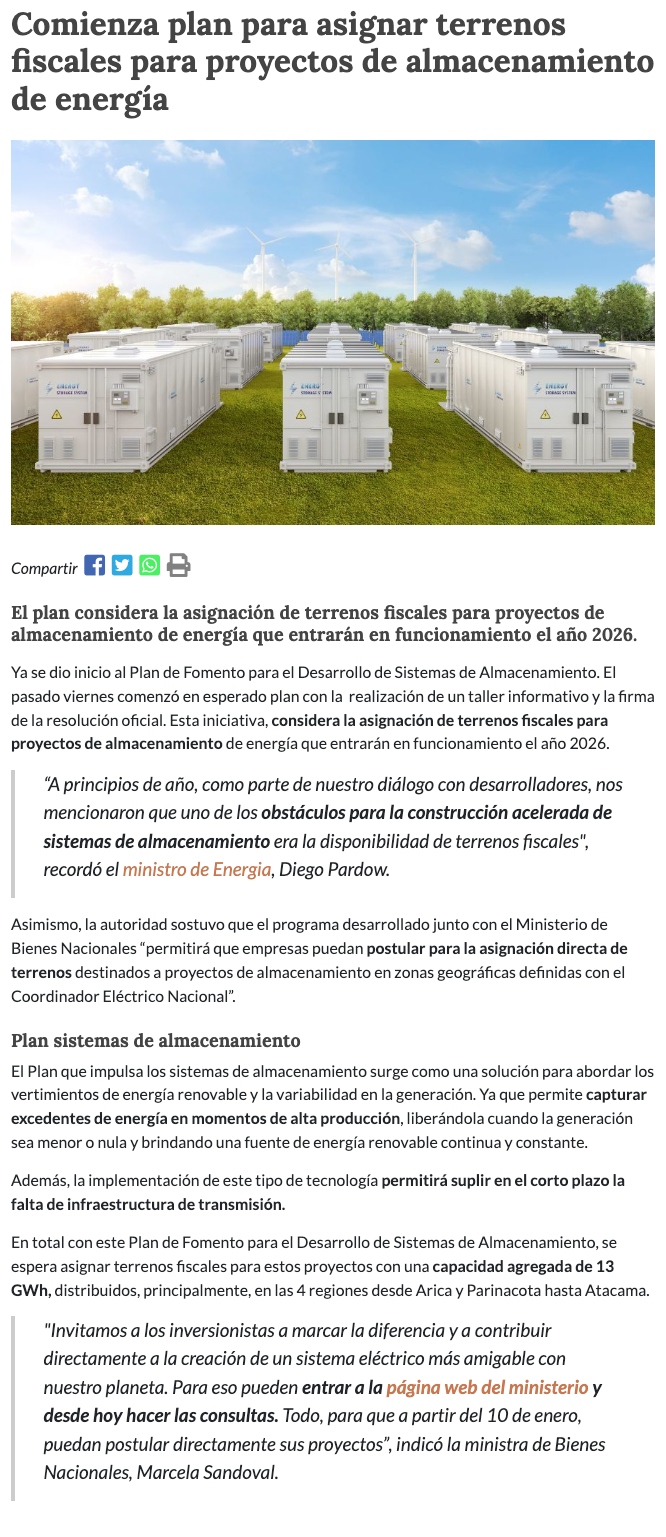 Comienza ejecución de plan que asignará terrenos fiscales para proyectos de almacenamiento de energía - (latribuna.cl)