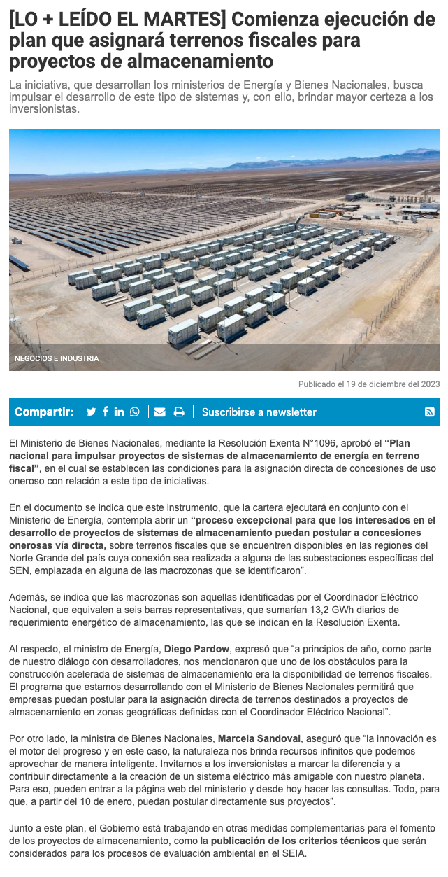 Comienza ejecución de plan que asignará terrenos fiscales para proyectos de almacenamiento de energía - (latribuna.cl)