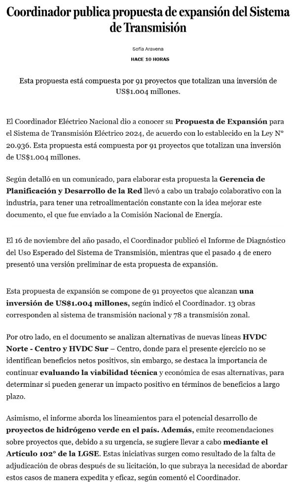 Coordinador Eléctrico propone 91 proyectos para el sistema de transmisión - (Diario Financiero)