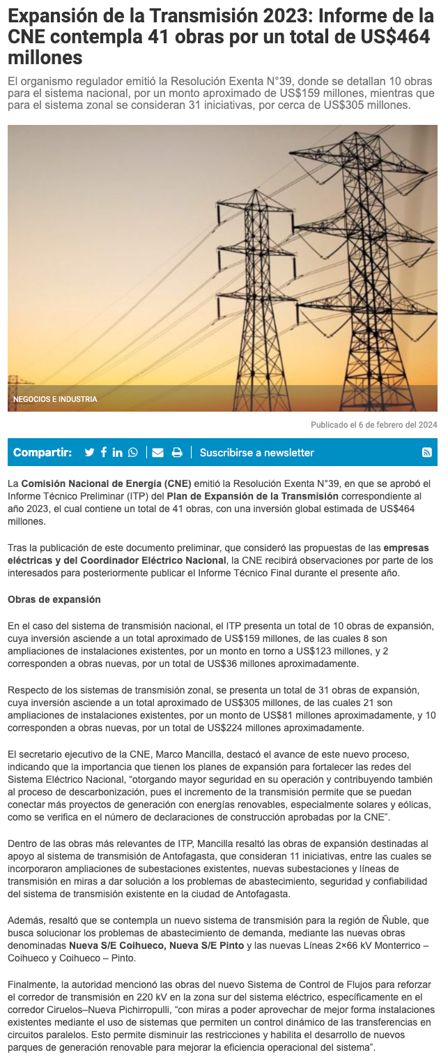 CNE: Plan de expansión de transmisión eléctrica contempla obras por US$464 millones - (portalminero)