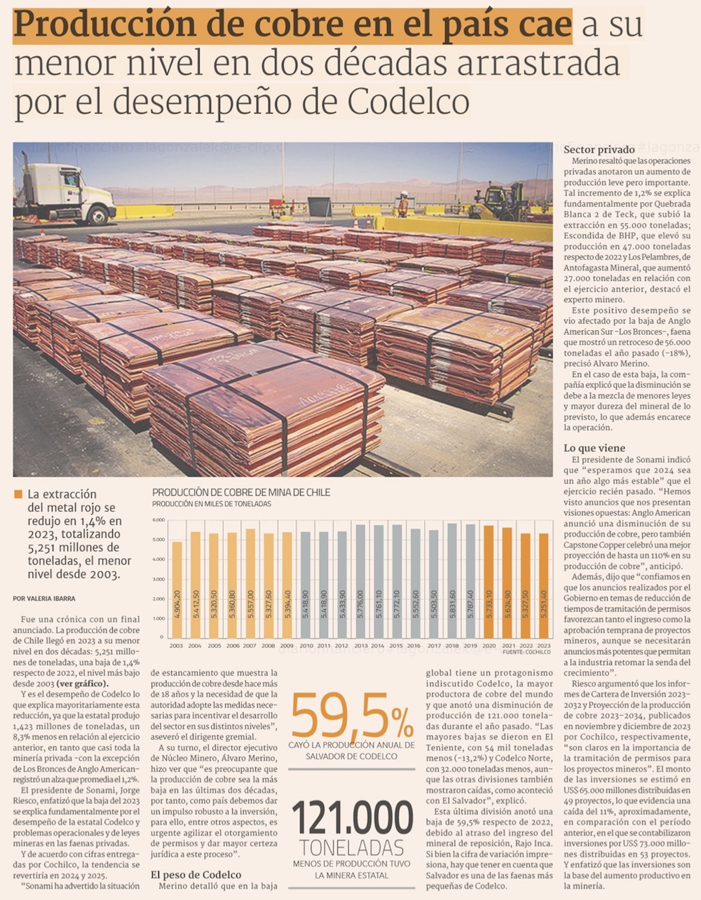 Producción de cobre en Chile cae a su menor nivel en dos décadas arrastrada por baja en Codelco - (Pulso)