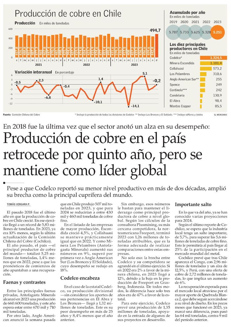 Producción de cobre en Chile cae a su menor nivel en dos décadas arrastrada por baja en Codelco - (Pulso)