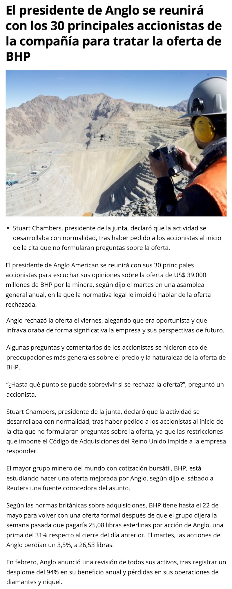 El presidente de Anglo se reunirá con los 30 principales accionistas de la compañía para tratar la oferta de BHP - (DF Online)