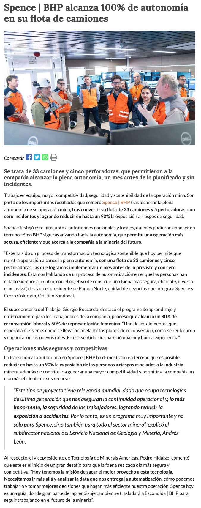Spence/BHP alcanzó el 100 por ciento de autonomía en su flota de camiones mina - (revistacrisol.cl)