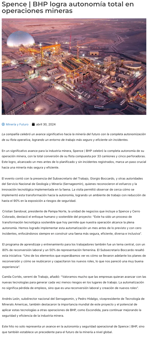 Spence | BHP celebra plena autonomía en su operación mina - (Maray Online)