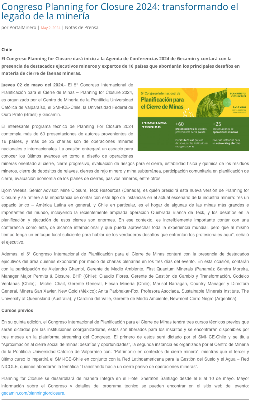 Congreso Planning for Closure 2024: transformando el legado de la minería - (nuevaminería online)