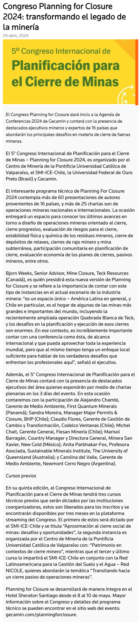 Congreso Planning for Closure 2024: transformando el legado de la minería - (portalminero)