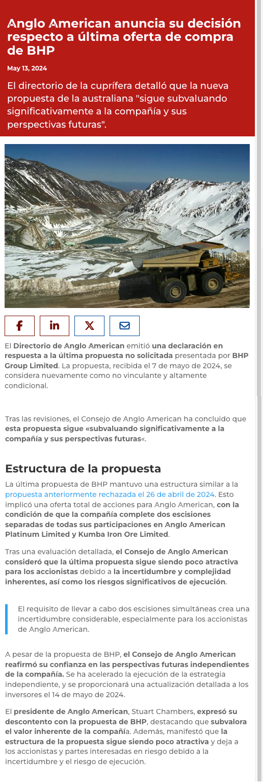 Anglo American rechaza propuesta de adquisición de BHP valorada en más de USD$42.700 millones - (mineriayfuturo.cl)