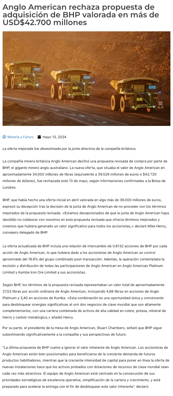Anglo American anuncia su decisión respecto a última oferta de compra de BHP - (mch.cl)