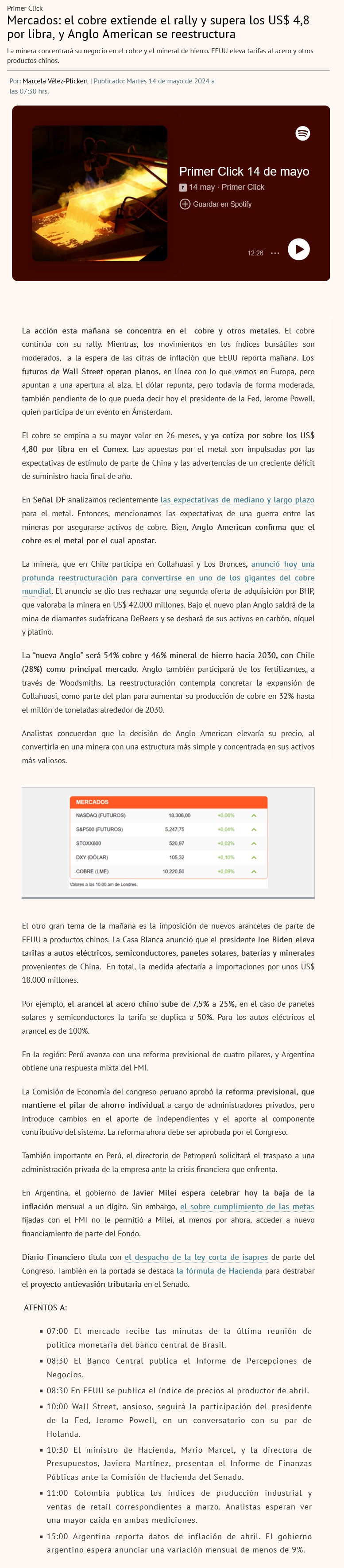 La especulación financiera da un nuevo impulso a cotización del cobre y llega a US$ 4,57 - (El Mercurio de Santiago)