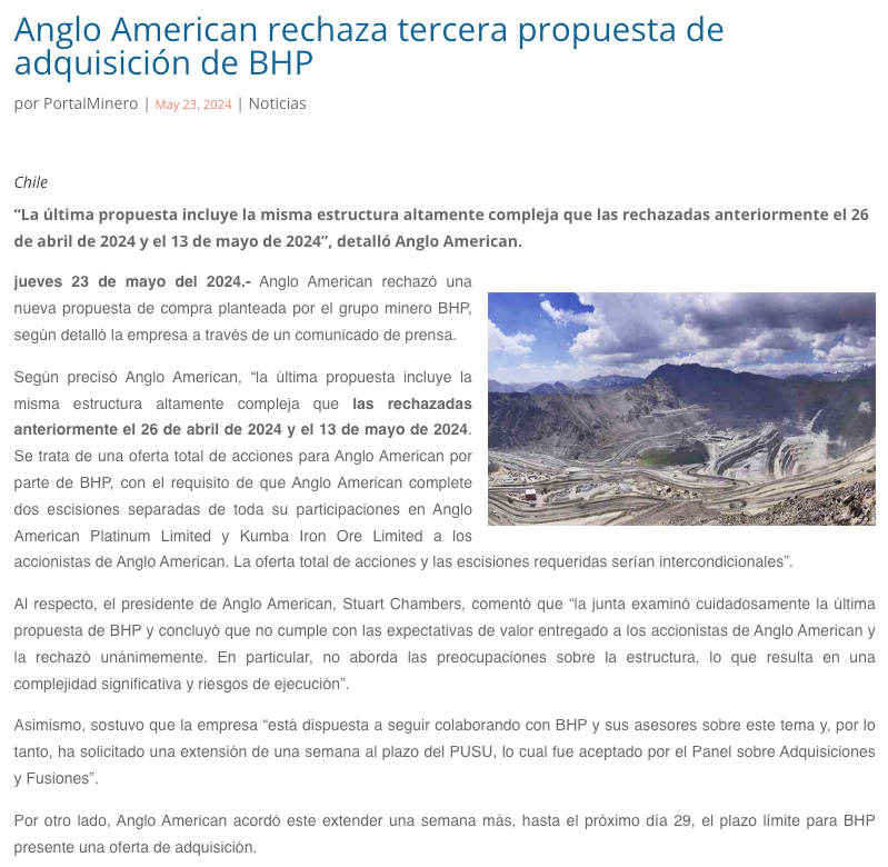 ¿La cuarta es la vencida? Anglo American vuelve a rechazar oferta de BHP, pero extiende plazo hasta el 29 de mayo - (reporteminero)