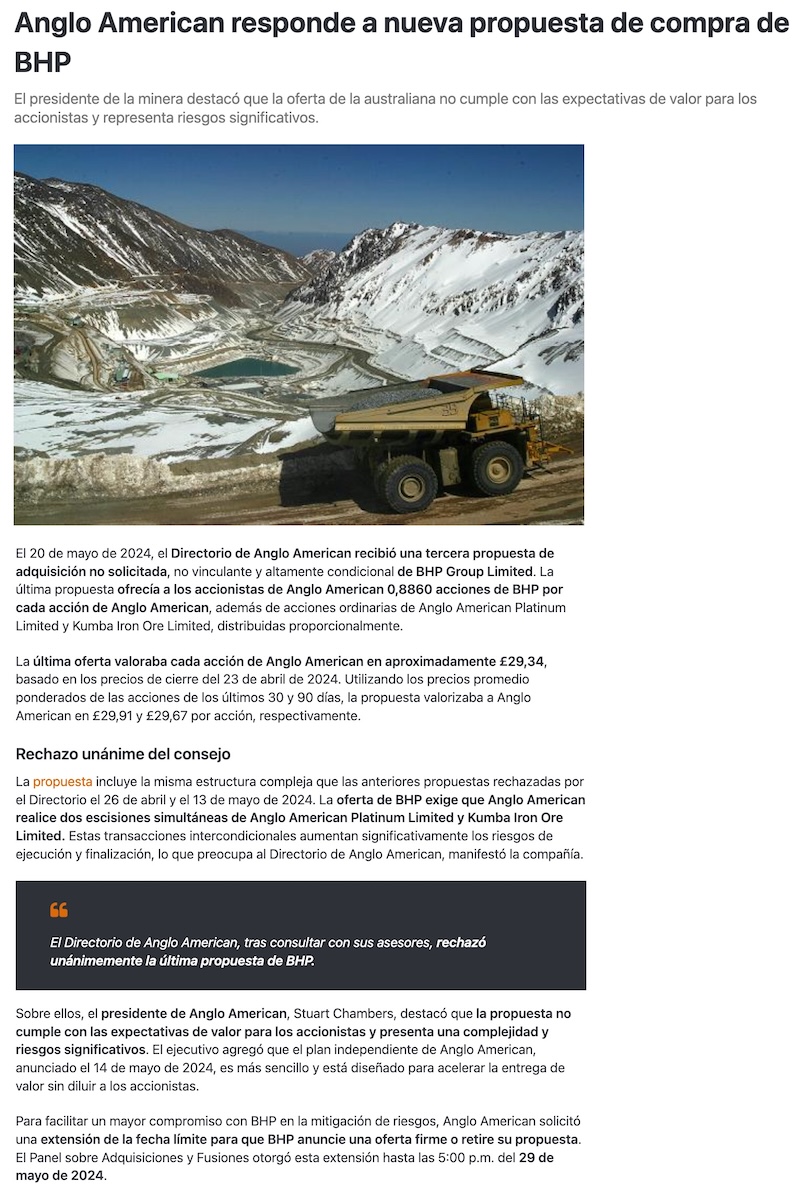 La tercera no fue la vencida: Anglo American vuelve a rechazar oferta de compra de BHP - (El Chañarcillo)