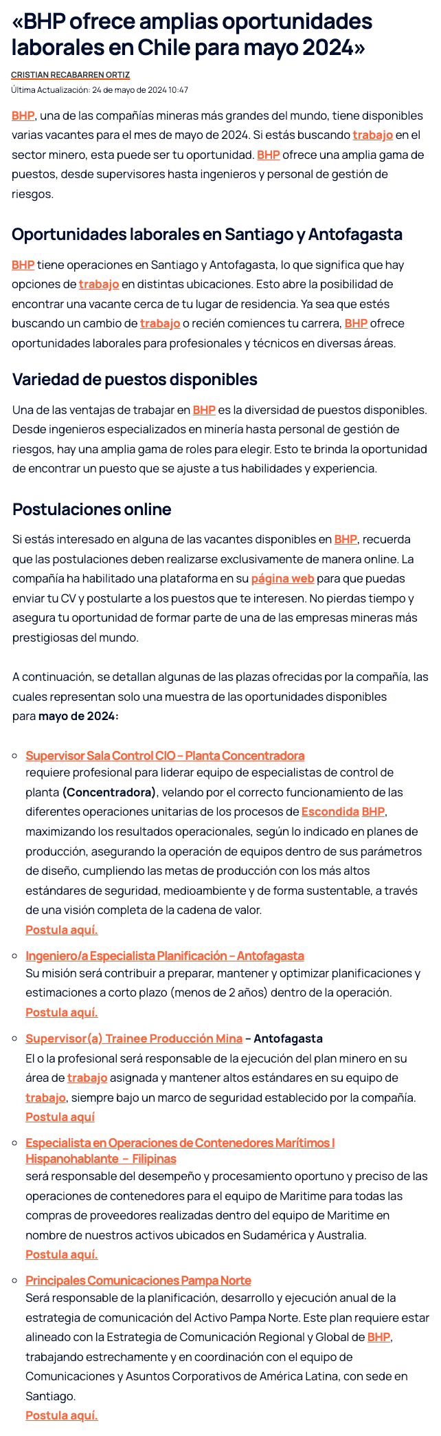 BHP ofrece amplias oportunidades laborales en Chile para mayo de 2024 - (news.eseuro.com)