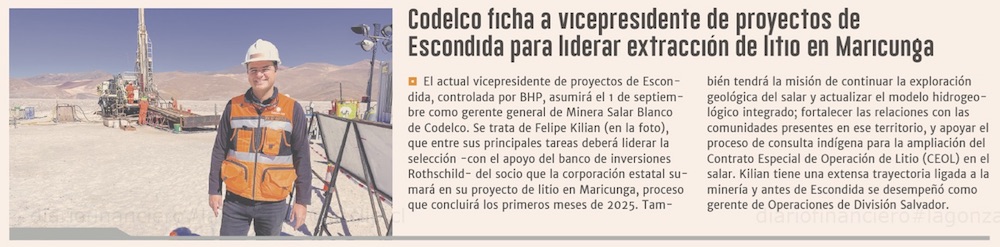Codelco ficha a alto ejecutivo de Escondida para hacerse cargo de proyecto de litio en Maricunga - (La Tercera Online)