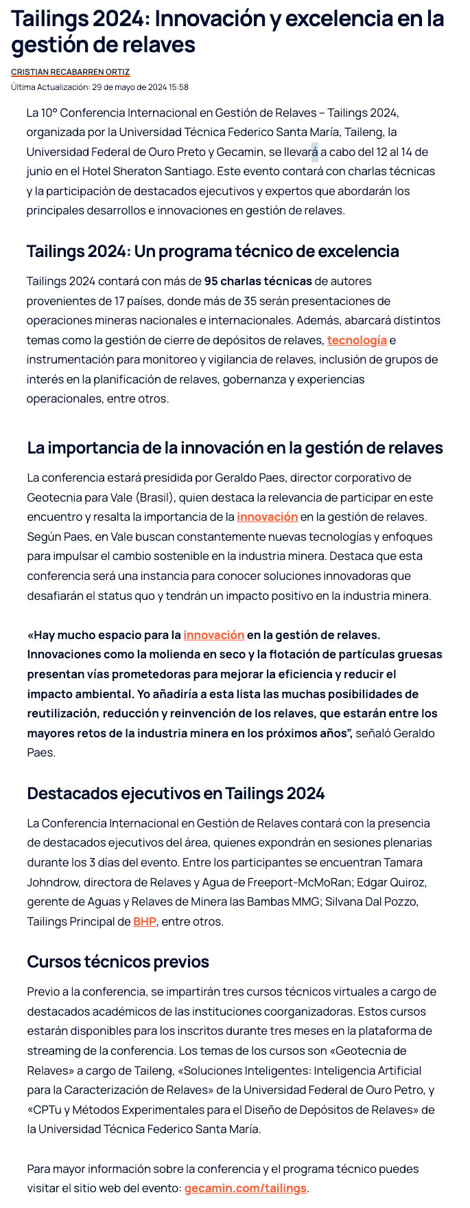 Conferencia Tailings 2024: Avanzando Juntos en la Gestión de Relaves - (portalinnova.cl)