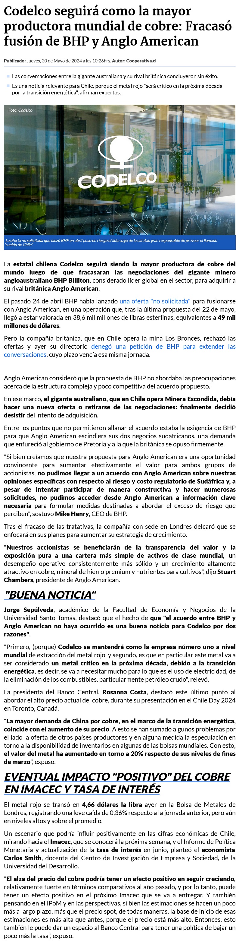 BHP no logró acuerdo para adquirir Anglo American - (Antofagasta TV)