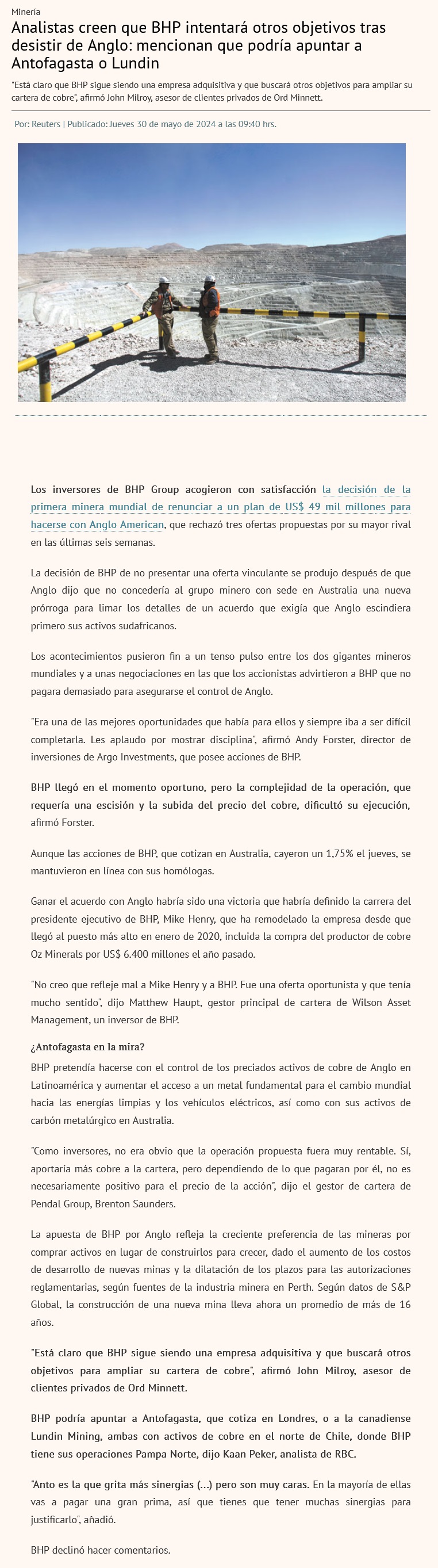 Analistas creen que BHP intentará otros objetivos tras desistir de Anglo: mencionan que podría apuntar a Antofagasta o Lundin - (redimin)