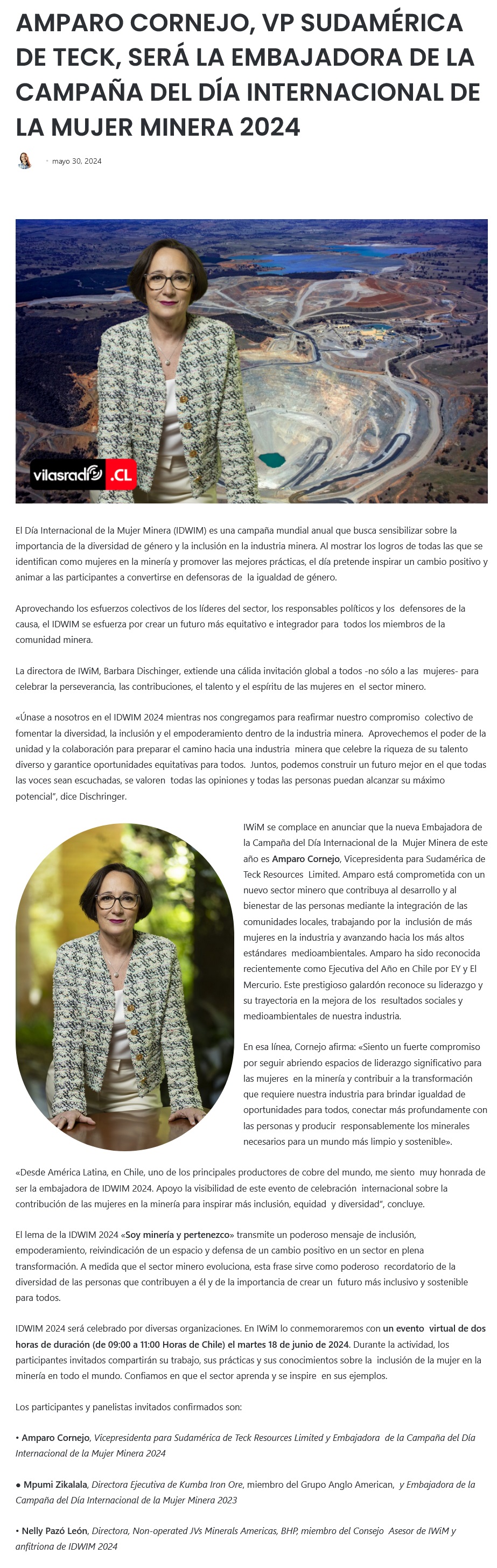 Amparo Cornejo, VP Sudamérica de Teck, será la embajadora de la campaña del Día Internacional de la Mujer Minera 2024 - (mvcomunicaciones.cl)
