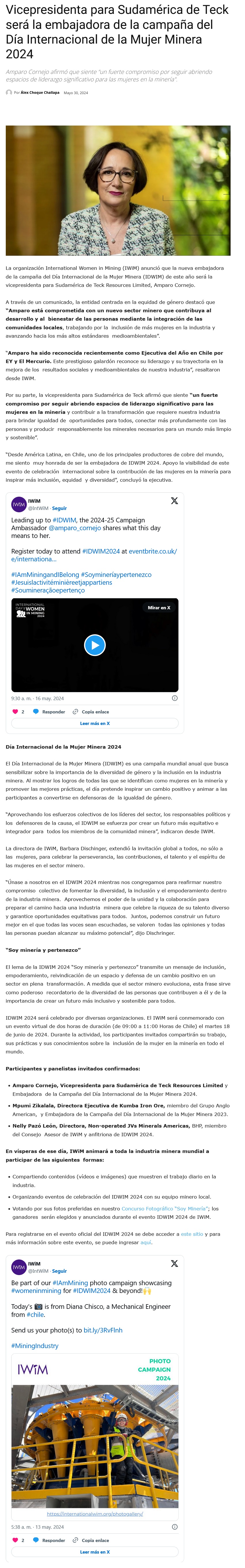 Amparo Cornejo, VP Sudamérica de Teck, será la embajadora de la campaña del Día Internacional de la Mujer Minera 2024 - (mvcomunicaciones.cl)