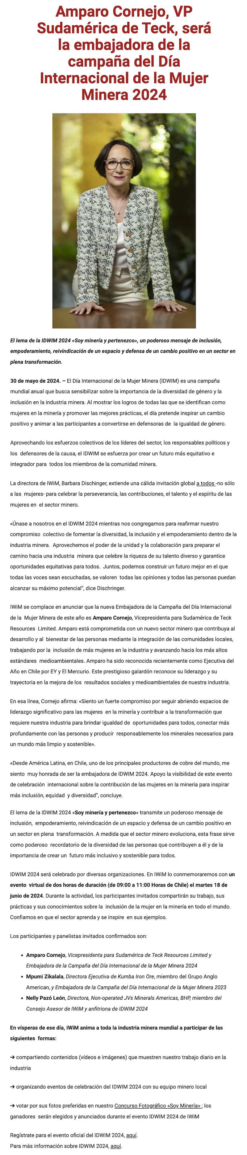 Amparo Cornejo, VP Sudamérica de Teck, será la embajadora de la campaña del Día Internacional de la Mujer Minera 2024 - (mvcomunicaciones.cl)