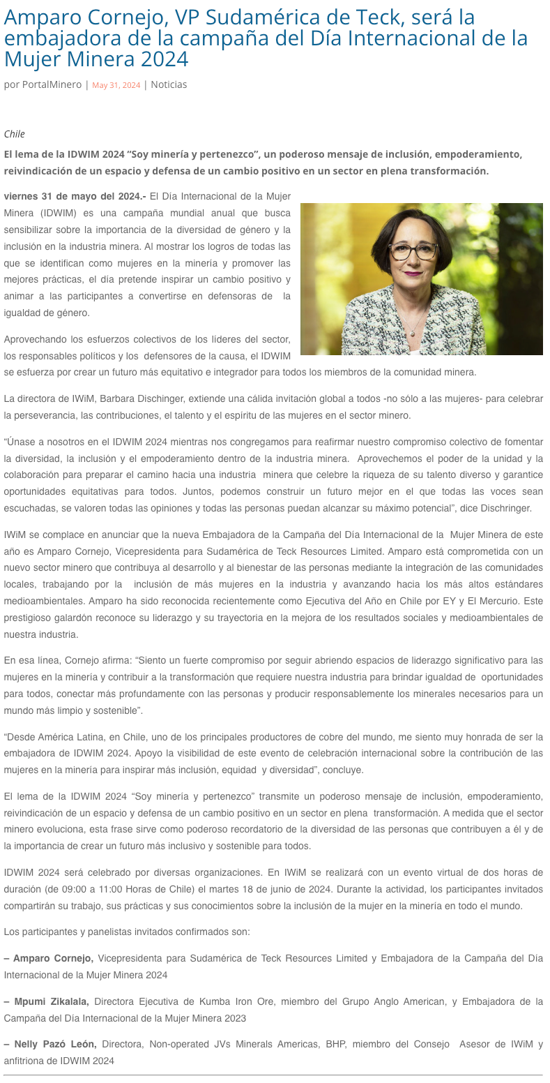 Vicepresidenta para Sudamérica de Teck será la embajadora de la campaña del Día Internacional de la Mujer Minera 2024 - (radiopaulina.cl)