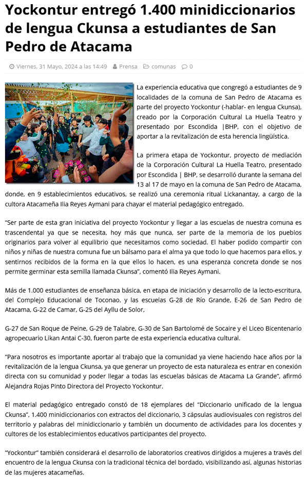 Yockontur entregó 1.400 minidiccionarios de lengua Ckunsa a estudiantes de San Pedro de Atacama - (regionesnoticias.cl)