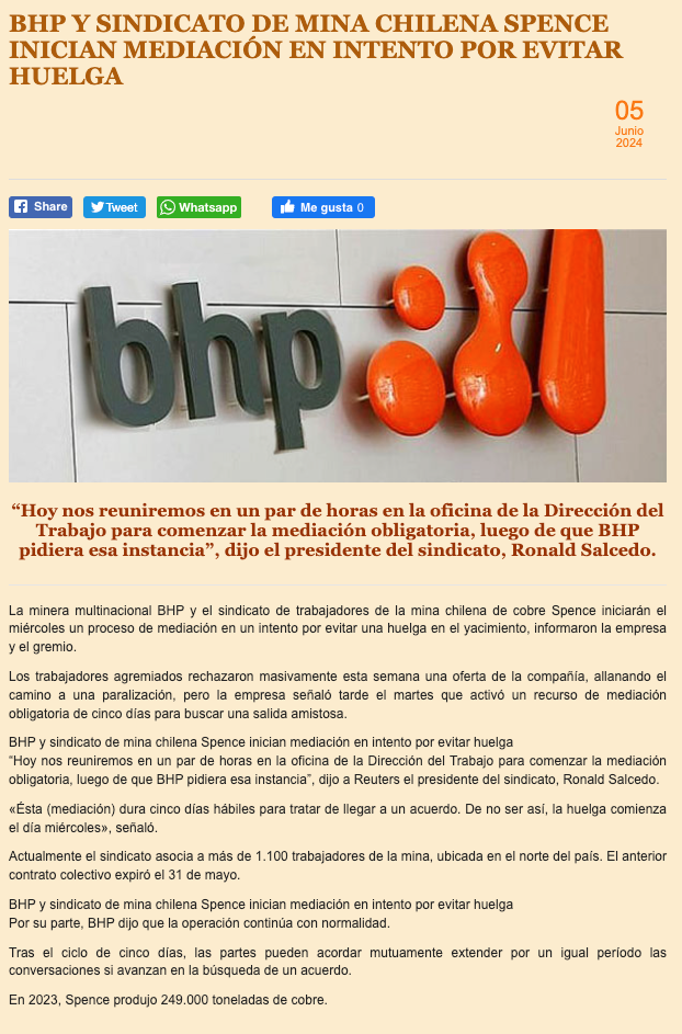 Para evitar huelga, BHP y sindicato de Spence inician mediación - (Nostálgica Online)
