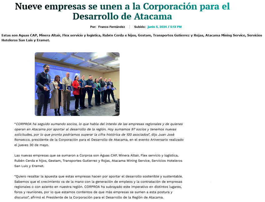 Corproa anuncia que nueve empresas se integraron a la organización - (El Diario de Atacama)