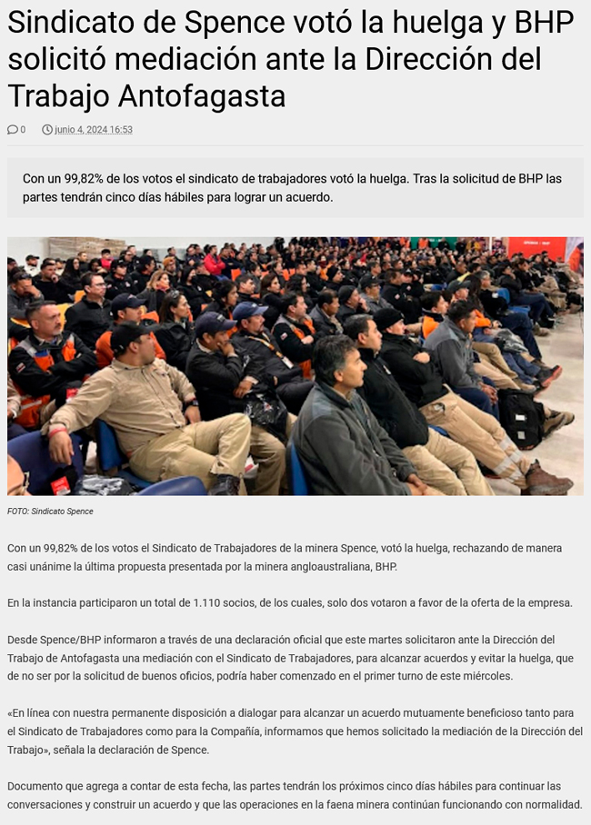 Sindicato de la Minera Spence de BHP decide irse a huelga: Empresa solicitó mediación de la DT - (atacamanoticias)