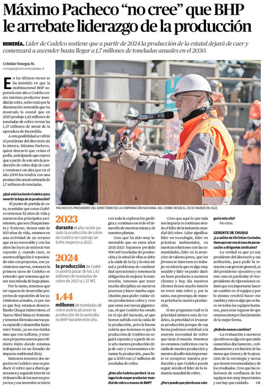 Presidente del directorio de Codelco “no cree” perder ante BHP el liderazgo de la producción - (soycalama)