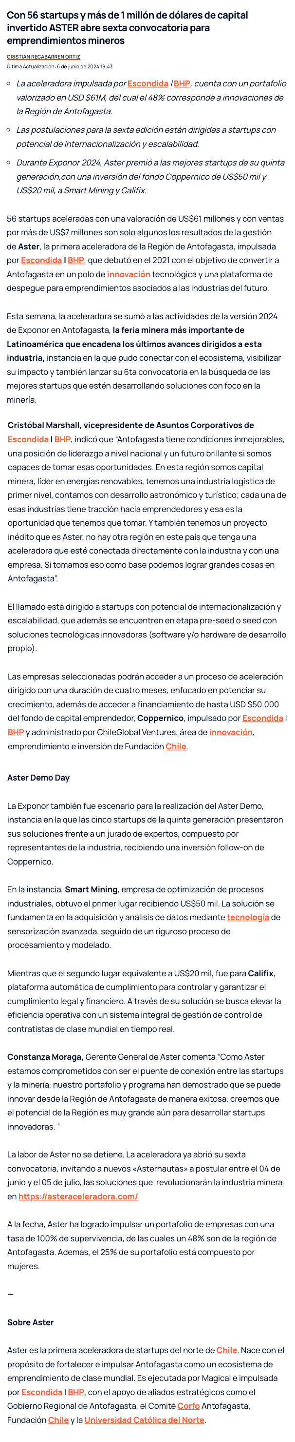 Con 56 startups y más de 1 millón de dólares de capital invertido ASTER abre sexta convocatoria para emprendimientos mineros - (g5noticias.cl)