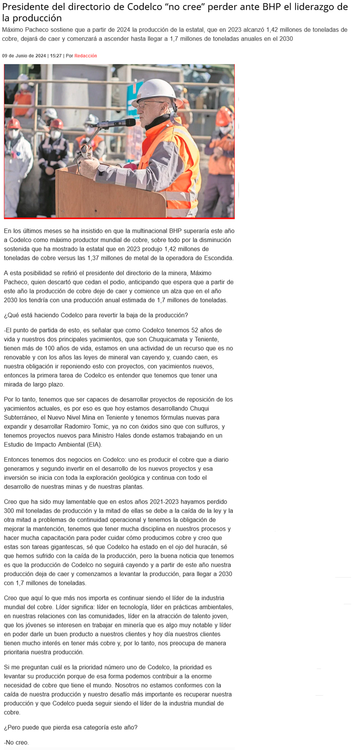 Presidente del directorio de Codelco "no cree" que BHP le arrebate liderazgo de la producción - (El Mercurio de Calama)