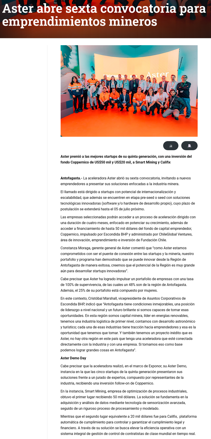 Con 56 startups y más de 1 millón de dólares de capital invertido ASTER abre sexta convocatoria para emprendimientos mineros - (g5noticias.cl)