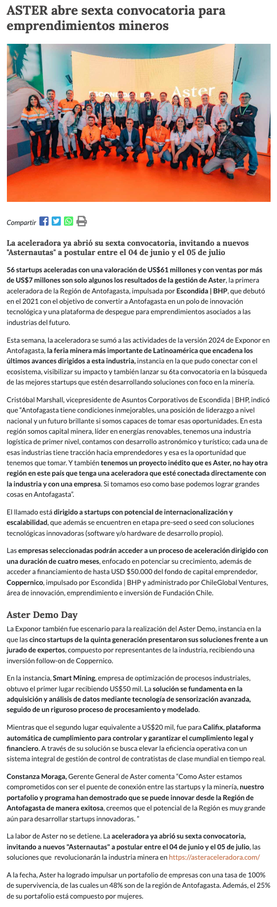 Con 56 startups y más de 1 millón de dólares de capital invertido ASTER abre sexta convocatoria para emprendimientos mineros - (g5noticias.cl)