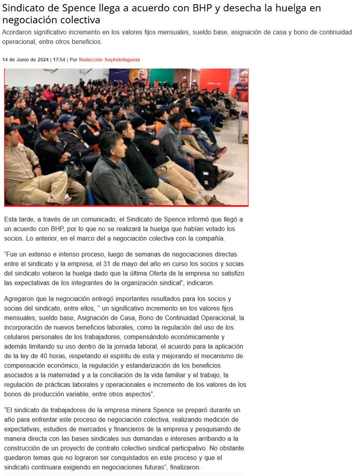 Sindicato de la mina de cobre Spence acepta contrato y evita huelga - (redimin)