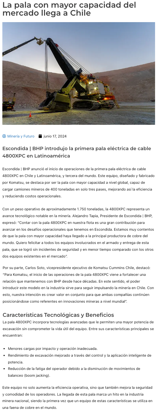 Escondida | BHP recibe la primera pala eléctrica de cable 4800XPC en Latinoamérica y la tercera de su tipo en el mundo - (fm7.cl)