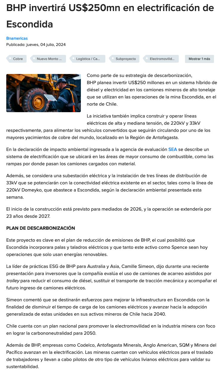 BHP ingresa permiso para transporte eléctrico en Escondida - (Pulso)